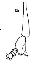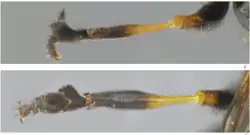 The legs are mostly dark, with broad apices of femora and bases of tibiae pale. The fore femur has short, stiff black setae spaced irregularly on the anteroventral and posteroventral surface. The first fore tarsomere has a large, anterior triangular process on the apical half. The first 4 tarsomeres of the mid leg are strongly flattened, each with a broad, apically rounded process which are progressively shorter from the first to third tarsomere.[4] External images