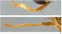 The legs are mostly pale. The coxae, trochanters, and hind tarsomeres 1, 4, and 5 being dark. The front femur has a posterior subbasal tuft of 2-3 long, thin, wavy, closely appressed white setae, followed by a regularly spaced row of 4-5 posterior, long, black setae with wavy tips. The longest black seta is approximately twice as long as the femoral diameter. The front tibia is somewhat strongly broadened from base to apex, with a posteroapical angle that is produced and bluntly rounded. The first front tarsomere is widened posteriorly, slightly narrower than the apex of the tibia, and about twice as long as it is wide. The remaining front tarsomeres are slightly narrower than the first and unmodified. The middle femur has an anteroventral row of 10-22 short, stiff, black setulae on the apical two-thirds, which usually ends in 1 or 2 longer setae that are strongly curved towards the base of the femur. The setulae of this row are no more than half the diameter of the femur, and the curved setae are approximately equal in length to the diameter of the femur. The middle femur also has 3-6 ventral, black or yellow setae on the basal half, which are approximately twice as long as the femoral diameter. The first hind tarsomere is swollen and approximately three times as long as its greatest depth. The legs are otherwise unmodified.[6]