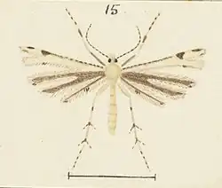 ♂︎ 17 mm. Head and thorax yellowish- white, metapleura with an oblique black streak, frontal cone of scales moderately long. Palpi 3+1⁄2, white, apical 2⁄3 externally irrorated with dark fuscous. Abdomen pale whitish-yellow, with a black lateral dot near base, and a few black lateral scales posteriorly. Legs white, banded with dark fuscous. Forewings cleft from 3⁄4, upper segment rather narrow, apex produced, pointed, lower segment much broader, posteriorly dilated; whitish, tinged with pale yellow; costa towards base shortly strigulated with fuscous irroration; a small triangular fuscous spot irrorated with dark fuscous on costa before fissure, not reaching across first segment, and a smaller similar mark on costa between this and apex : cilia ochreous-whitish, spotted with fuscous round lower angle of first segment, and upper angle and termen of second, with a small black scale-tooth on dorsum at 2⁄3. Hindwings reddish-fuscous; cilia whitish, slightly reddish-tinged, with a blackish basal mark on lower half of termen of first segment, and mere traces of black scales in middle of dorsum of third segment.[3]