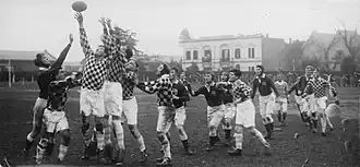 After playing Argentina, the Lions moved to Rosario to play a combined team composed by players of porteños clubs Universitario and Gimnasia y Esgrima due to the impossibility of joining a competitive team with the small number of players in Rosario. Players of both teams arrived in Rosario after a long journey by train from Retiro to Rosario Norte station, the same day of the match. On August 3, 1927, the Lions defeated the combined team by 24–0 in a rainy day held in Plaza Jewell.[13]