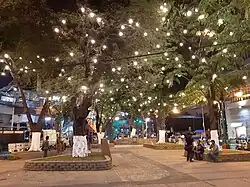 The plaza was renovated again in 2014, during the tenure of Mayor Joseph Estrada. Neglected during the tenure of his predecessor, Alfredo Lim, the second renovation entailed the installation of new light fixtures, benches and a perimeter fence, as well as landscaping. The renovation came at no cost to the city government, as it was sponsored by the nearby Medical Center Manila through the city's public-private partnership program.[1] The hospital partnered again with the city for its 52nd anniversary to renovate the plaza a third time during the tenure of Estrada's successor, Isko Moreno, which included improved landscaping, newly-painted fences and pavement improvements,[4] as well as the installation of capiz shell light fixtures.[5] Again coming at no cost to the city government, the renovated plaza was inaugurated on August 15, 2019.[6]