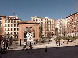 Its name remembers the Dos de Mayo Uprising in 1808 that marked the beginning of the Spanish War of Independence.[2] The plaza features a monumental arch in its centre dedicated to Luis Daoíz and Pedro Velarde, two soldiers fallen to the French army on 2 May 1808 who became heroes in the national imaginary.[2] The area was the place where the Monteleón Artillery barracks lied in 1808 and where the heroic defense of the aforementioned "martyrs" took place.[3]