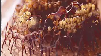 A study showed that a typical nest would rear between 1–5 gynes during an observation period that varied between 6 and 18 months. However, it was also noted that on occasion P. remota may produce a high number of gynes, up to 46. Another thing to note is that gynes can be produced in the same cells that give rise to the worker class. The only difference between the queen and the workers is that queens are generally bigger, however this is not always the case since it has been documented that queens can be the same size as the workers. The same study also showed that there is no correlation between the queen's size and whether they are accepted or have a successful mating.[8] Queens emerge always attractive, meaning that they cause changes in the intranidal behavior of the workers. Normally after gynes are produced, a majority of them are killed by the workers. The ones that survive can be kept alive in cerumen chambers protected by a barrier of wax called the royal camber.[14] It is those survivors who will go on and form new colonies.[8]