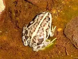 Pleurodema bufoninum, the large four-eyed frog, is a species of frog in the family Leptodactylidae. It is found in Argentina and Chile. Its natural habitats are subantarctic forests, temperate forests, subantarctic shrubland, temperate shrubland, subtropical or tropical dry shrubland, subantarctic grassland, temperate grassland, intermittent rivers, swamps, intermittent freshwater marshes, arable land, rural gardens, ponds, and open excavations. The common name "four-eyed frog"[2] refers to two inguinal poison glands that resemble eyes.[3] When threatened, the frog lowers its head and raises its rear. When the frog adopts this posture, the poison glands are also raised toward the predator. The predator may also confuse the frog's raised posterior for the head of a larger animal.[4]