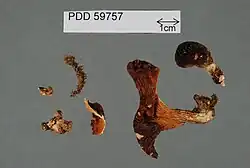 - ^ a b c "VIRTUAL MYCOTA: NZ Fungi Identification: Pleurotus novae-zelandiae". virtualmycota.landcareresearch.co.nz. Retrieved 2023-02-26.