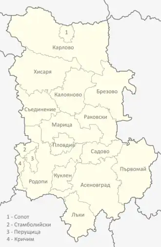 The province's capital is the city of Plovdiv; other towns include Karlovo, Sopot, Klisura, Kalofer, Hisarya, Saedinenie, Rakovski, Brezovo, Stamboliyski, Krichim, Perushtitsa, Sadovo, Parvomay, Asenovgrad, Laki, Katunica, and Yiagodovo.