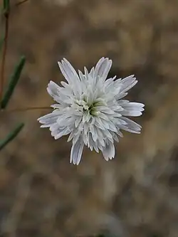 Podelepis capillaris, sometimes referred to as an invisible plant is a wiry many branched annual herb that can grow up to 45 cm high. It has thin stems that a widely smooth except for cobwebbed hairs in leaf axils. Leaves are few, they grow in a linear fashion. They are smooth and small and soon wither on plant, they connect directly to the stem (cauline) and are 0.5 – 4 cm long. Flowers are formed as a radiate head.[4] Florets are capitula and grow in ray florets of 9-12 petals and disc florets of 17–22. Podelepis capillaris can be differentiated from other species in the genus Podolepis by it having mostly white flowers, often with a purple line on the underside.[5] This species is a prolific flowerer and flowers throughout August to March.[6] In comparison to most other Podolepis it grows with minimal leaves due to an adjustment to its local environment.