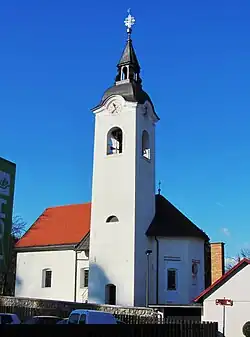 Saint Martin's Church in the village is a chapel of ease. It was first mentioned in written sources in 1414.[10] It was remodeled in Baroque style after a fire in 1749.[5] It formerly belonged to the Parish of Saint Peter in Ljubljana, but was reassigned to the Parish of Dobrova in 1785. The altars are of unknown age and were reworked by the sculptor Leopold Gecelj in 1872. At the end of the 19th century the church possessed two chalices, one dating from 1573 and another of presumably equal age. The bell tower of the church was octagonal until 1856, when it was torn down and rebuilt larger for a new bell. The walled area around the church probably contained a cemetery at one time because the parish church in Ljubljana was too far away and the nearest cemetery, in Dobrova, was in another parish.[11] The main altar was created by the stonemason Alojz Vodnik from Podutik in 1902.[10]