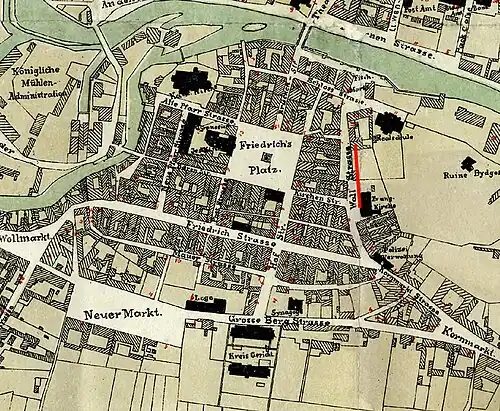 Originally at Wallstraße 17 and dated back to the late 18th century, it has been rebuilt in 1879–1880 by its then owner, Heinrich Schrödter, a butcher.[12] It then was the property of a merchant, Ber Cohn, until the end of World War I.[13]