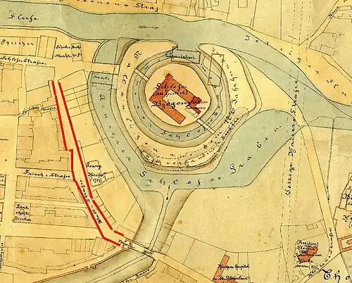 Podwale Street ("Wall strasse") on a 16th-century map of Bydgoszcz, reconstituted in 1890