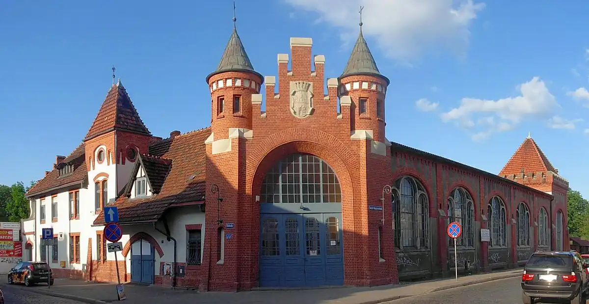 The Market Hall has a rectangular shape and is covered with glass-steel panes, the facades are made of brick.[11] Above the main entrance gate stands the crest of Bydgoszcz.