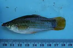 Poecilia gillii is primarily greyish with blue highlights and rows of yellow spots on the sides. Females from some estuarine habitats are dotted black instead. Most of the fins are yellowish.[2] Adult males differ widely in body size, color, and morphology.[3] Some males develop a long dorsal fin, which, along with the caudal fin, usually has spots or black blotches close to the fish's body. The caudal fin of the males from some tideland populations is edged orange. Some other populations contain males with the dorsal and caudal fins colored red.[2]