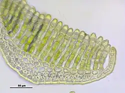 Mosses belonging to the class of Polytrichopsida are known for several defining characteristics such as stem leaves with unistratose lamina, numerous lamellae, a costa, stereids, guide cells, and hydroids. Polytrichopsida mosses also have a strong conducting strand composed of hydroids (water conduction) and leptoids (conduction of sugar and other nutrients), leaf traces, and stereids.[9] Due to the lack of gemmae producing structures in the majority of mosses that belong to this class, Polytrichopsida mosses reproduce sexually by spore dispersal. However, asexual reproduction by fragmentation is possible. This class is also well known for a hairy calyptra that is present in many Polytrichopsida mosses which functions to protect the developing sporangium. Some species of Polytrichum also have biseriate paraphyses in its perigonium (composed of an antheridium, paraphyses and perigonial leaves) structure.[9]