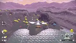 Pokémon Legends: Arceus is an action role-playing game that maintains the core gameplay of past mainline entries.[1] The player can freely explore the game map, which is divided into five large areas of individual biomes. Each time the player enters an area, they spawn in a camp and can fast travel to other camps in the same area. Outside of traversing the landscape on foot, the player can unlock rideable Pokémon which can travel faster, swim across bodies of water, climb cliffs, or fly.[2] In each area, Pokémon wander the landscape and certain habitats and will interact with both the player and their environments. Some will actively avoid the player, while others act aggressively, and some exhibit other specific behaviors. "Alpha" Pokémon – larger, more powerful versions of the Pokémon – can also be found in the areas.[3] The game world having multiple areas and a hub system instead of fully open world gameplay resulted in reviewers comparing Legends: Arceus with the Monster Hunter series.[4][5] Reviewers also drew comparisons between Pokémon Legends: Arceus and The Legend of Zelda: Breath of the Wild, noting apparent similarities in both gameplay and art style.[6][7][8]