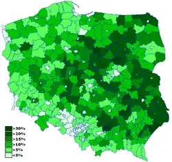 In the 2010s, the party started to lose support between rural voters (especially in southeast of Poland, e.g. Subcarpathian Voivodeship). In 2019 election PSL gained surprisingly significant support in cities and won mandates (e. g. in Warsaw and Wrocław).[113]