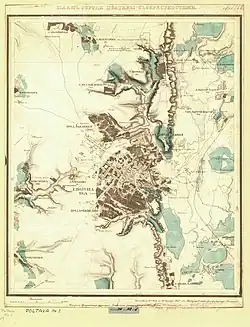 The city suffered from the Great Turkish War when in 1695 Petro Ivanenko led an anti-Muscovite uprising with the help of Crimean Tatars, who ravaged the local monastery.[6] The same year the Poltava Regiment actively participated in the Azov campaigns which resulted in the taking of the Turkish fortress of Kyzy-Kermen (today the city of Beryslav, Kherson Oblast).[6] On 8 July (New Style) or 27 June (Old Style) 1709 the Battle of Poltava took place near the city during the Great Northern War. The battle ended in a decisive victory of Peter I of Russia over the Swedish forces and had great historical importance for the Russians.[6] In 1710 there was a plague in the city and its surrounding area.[6] In the mid-18th century the Kolomak Woods near Poltava became a base of haidamaks (Cossack paramilitary bands).[6]