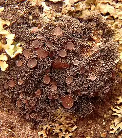 Polychidium is a genus of lichen-forming fungi in the family Massalongiaceae.[2] These lichens form tiny, shrub-like tufts with branching filaments that create woolly cushions on moss-covered rocks and tree twigs. The genus was traditionally thought to include four similar-looking species, but molecular studies revealed that three of these actually belong to a different genus called Leptogidium. Today, Polychidium in the strict sense contains only P. muscicola and three closely related species, found from tropical to subarctic regions worldwide.
