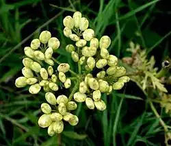 This plant is a biennial[2] or perennial herb growing up to 1 meter tall. The inflorescence is made up of many small yellow flowers borne in umbels. The leaves are up to 18 centimeters long and are divided into toothed lobes. They clasp the stem at their bases. They are mostly alternately arranged, but the upper ones can be oppositely arranged.[1] The plant is yellowish in color during spring and summer.[2]
