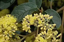 Pomaderris elliptica, commonly known as yellow dogwood[2] or smooth pomaderris,[3] is a species of flowering plant in the family Rhamnaceae and is endemic to south-eastern Australia. It is a shrub with densely hairy branchlets, egg-shaped or elliptic leaves, and pale yellow flowers.