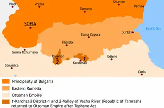 The republic survived until 1886, when Eastern Rumelia was incorporated into Bulgaria.[1] Then the area was returned to the Ottoman Empire.