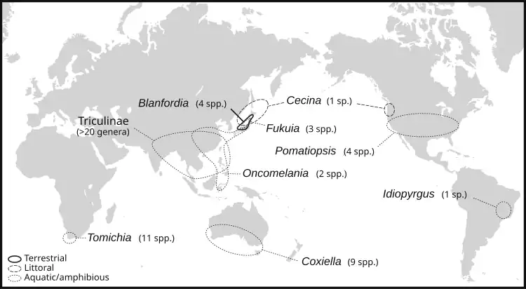Species in the family Pomatiopsidae occur worldwide.[1] The generic diversity of Pomatiopsinae is particularly high in the Japanese Archipelago, where four of the eight genera, including two endemics, are recorded.[1] The subfamily Triculinae radiated as aquatic snails in freshwater habitats in Southeast Asia.[1]