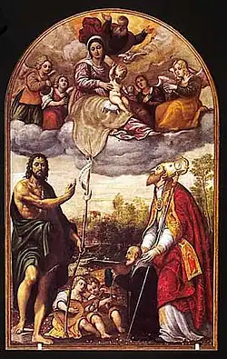 Pomponio Amalteo was born at Motta di Livenza in Veneto in 1505.[1] He was a pupil and son-in-law of Il Pordenone, whose style he closely imitated; he inherited Pordenone's studio in Friuli, where he led a long career.[2] As Pordenone became increasingly active in Venice in the 1530s, Pomponio Amalteo was allowed to emerge as an independent master. He also became an inheritor of part of his Friulian approach, kind of an arrangement, cemented by his marriage to Pordenone’s daughter in 1534.[3] His works consist chiefly of frescoes and altarpieces and many of which (for instance those in the church of Santa Maria de' Battisti and the altarpiece of Saint Sebastian (1533) at the duomo of San Vito al Tagliamento) have degraded greatly over time. Five pictures representing subjects of Roman history painted by Amalteo adorn the Hall of the Notaries at Belluno. He also frescoed a series of judges for a loggia in the court of justice in Ceneda.