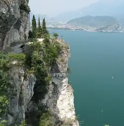 It was constructed by Giacomo Cis between 1848 and 1851 in the steep north-western ranges of the Garda Lake. Initially, it was fashioned out of the limestone which formed some of the rock formations on the mountains themselves.[1] The road suffered from regular landslides,[2] so a separate road tunnel has been built in 1998. Since then the road had been officially closed, but has been popular by hikers and mountain-bikers. In 2000 another landslide happened with various casualties, so the road had been closed again. Due to the immense popularity of the track with impressive views of the lake and its tunnels it reopened in 2004, however automobile traffic is not permitted.[3]