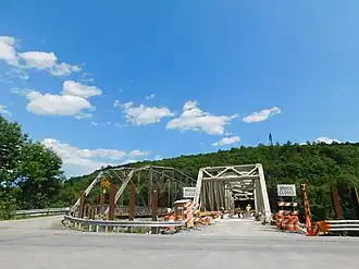 Over the years, the bridge's condition deteriorated, weakening its retaining strength. The National Bridge Inventory Survey categorizes its condition as "Structurally Deficient" and "Basically intolerable requiring high priority of replacement".[5] In 2005, the town of Narrowsburg passed a resolution calling on the Pennsylvania Department of Transportation (PennDOT) to replace the bridge. There has also been a local movement to save the bridge. The bluestone quarries are no longer active, but the bridge still serves as the only access to 26 homes on the Pennsylvania side and the only access those residents have to emergency services. Because of the state of the bridge, planning for its replacement began in 1999. An accident involving a dump truck in 2015 accelerated the replacement of the bridge, completed in November 2018.