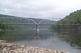 The Pond Eddy Bridge is a truss bridge spanning the Delaware River between the hamlet of Pond Eddy in Lumberland, New York and the settlement informally called Pond Eddy in Shohola Township, Pennsylvania; it is the Pennsylvania community's only road connection. It is accessible from NY 97 in Lumberland on the New York side and two dead-end local roads, Flagstone Road (State Route 1011) and Rosa Road on the Pennsylvania side. The current bridge was built in 2018, replacing one from 1903.[3]