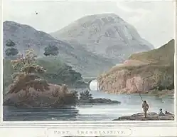 Pont Aberglaslyn is located near the downstream end of the Aberglaslyn Pass.[4] While the location is rocky with the river running through rapids just upstream, it is not far above sea level. The river was tidal and navigable up to around Pont Aberglaslyn until the early nineteenth century, when the construction of the Cob seawall near Porthmadog prevented the tide from reaching it.[5] Below the bridge is Llyn Glas (Blue Lake), a former harbour site used for loading copper mined nearby.[6][7][8]