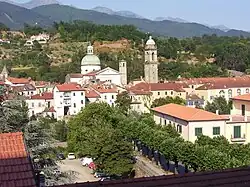 Pontremoli is believed to have been first settled around 1000 BC.[4] It was known in Roman times as Apua.[5] The commune later became an independent municipality in 1226 thanks to Frederick II who chartered the free municipality, partly because of its mountainous terrain. This terrain in the valley of the Magra also made Pontremoli a target for numerous conquests from rival Italian and foreign lords. Pontremoli was controlled by various aristocratic families, including the Malaspina (in 1319) and the Antelminelli (in 1322). The conflict between the rival Guelfi and Ghibellini factions in the early fourteenth century resulted in the construction of the Great Bell Tower (Il Campanone) to separate the rival camps. During these Medieval times Pontremoli was often visited by pilgrims travelling from Canterbury (England) to Rome.