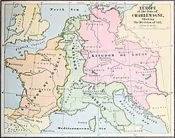 In 836, Lothair, in his role as king of the Lombards, began stripping the possessions of the Roman church. After appealing to Louis, the emperor sent an imperial envoy to investigate the matter. Although Gregory was sick, he managed to advise the envoy of the situation, and asked him to take a letter to the emperor outlining Lothair’s attacks on the Church, which they managed to get past Lothair’s troops at Bologna.[22] Then in 840, with Louis’ death and the accession of Lothair as emperor, war again erupted between the sons of Louis. Gregory made unsuccessful attempts to mediate in the conflict that ensued between the brothers, sending Archbishop George of Ravenna as his representative.[23] According to Prudentius of Troyes, George faithfully tried to achieve his objective, but failed due to Lothair’s refusal to allow George to see Lothair’s brothers. However, according to Andreas Agnellus, George tried to bribe Lothair to make his archbishopric independent of Rome, and was captured at the Battle of Fontenoy.[24] The subsequent Treaty of Verdun in 843 broke up the empire of Charlemagne, with Lothair retaining the imperial title and control of Italy.