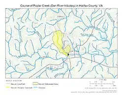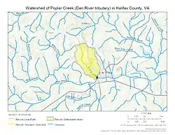 Poplar Creek rises in a pond at Centerville, Virginia, and then flows generally southeast to join the Dan River at South Boston.[3]