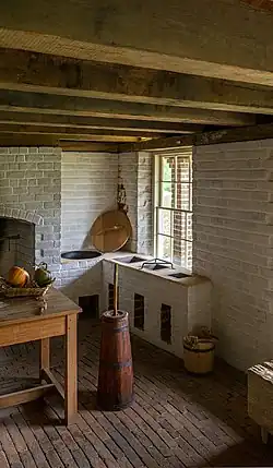 Excavations at this site also yielded a number of objects related to slave life at Poplar Forest. Archaeologists discovered iron saw files, gimlets, wedges, croze irons, and a hinge from a folding ruler; it is likely that these objects are from tools used by slaves either in their work assignments or in their personal space.[15] Scissors, straight pins, and thimbles found at the site suggest that women sewed for both work and for their families.[15] The excavations uncovered stoneware and earthenware that scholars believe to have been used to prepare food. Enslaved men and women at Poplar Forest ate fruits and vegetables as well as beef, pork, venison, opossum, rabbit, chicken, turkey, and fish, and possibly had access to firearms with which to hunt animals.[15]