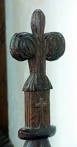 Poppyhead is a form of carving of the top of the end of a bench or a choir stall.[1] Its name is unrelated to the poppy flower. It is derived, by way of Old French, from the Latin word puppis, which means the poop or the figurehead of a ship. In its simplest, and its most usual form, it has the appearance of a stylised fleur-de-lys. In some cases, it consists of a much more intricate carving; for example in Holy Trinity Church, Blythburgh, some of the poppyheads represent the seven deadly sins.[2]