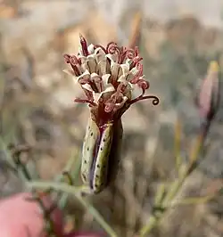 The inflorescence produces narrow flower heads which may be nearly 3 centimeters long when in bloom. The flower head is enclosed in five waxy, gland-studded phyllaries. It bears 20 to 30 flowers, which are disc florets. Each flower is white or purplish and has a long, curling style protruding from it. The fruit is a cylindrical achene topped with a pappus of bristles, the whole unit measuring over one centimeter long. These plants have many branches with numerous thin, wiry, upright stems.