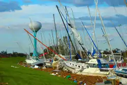 On September 24, 2005, Hurricane Rita made landfall between Sabine Pass, Texas, and Johnson Bayou, Louisiana, as a category 3 hurricane. A wind gust of 116 mph (187 km/h) was recorded in Port Arthur. The storm caused widespread significant wind damage throughout the city, with power outages lasting several weeks in some locations. Some areas of the city also received flooding due to Rita.[19]