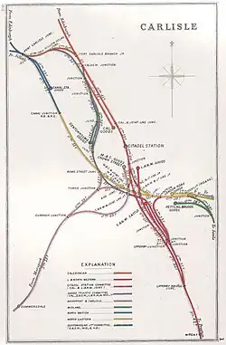 Port Carlisle Junction was a railway junction between the lines of the former Caledonian Railway and North British Railway companies lines to the north of Carlisle Citadel station in, what is now, Cumbria, England.[1] It opened in July 1863.[2] Port Carlisle Junction railway station was a very short lived station that first came into use in July 1863 and there was some untimetabled use until 29 October 1863, but the station closed as early as 1 July 1864.[3] After closure, the up (northbound) platform was retained for use by those crews requiring change and also for passing messages on to crews.