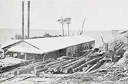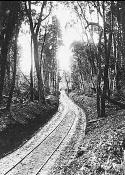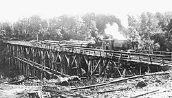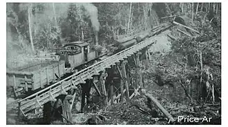 The construction started in 1917. In 1921 more than 1.6 km (1 mi) long section of track has been completed,[5] and this has been extended by 1925.[6] The screws of the trestle bridges were made locally by the blacksmith of Port Craig. He forged every morning a head onto either side of a batch of 200 bolts. He made these from round bars, which had been originally twice as long. Subsequently, he heated them up again and split these into two parts with a sledge hammer and a cold chisel. The teacher of the camp's school, who was employed by the sawmilling company helped him in the afternoon after finishing his classes by cutting the thread onto the bolts. The quality was high, because every bolt which exceeded the nominal length by more than one inch (25 mm) was rejected.[3]