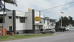 The main elevation, which faces to the north-east, features a protruding entry area and a parapet wall which extends for most of the length of the building. These are formed from timber sheeting. Narrow lengths of corrugated metal sheeting have been fixed to form column- like details within the parapet wall, framing each end and the entry area. The exterior is clad with chamferboards at the base with fibre- cement sheeting with timber cover strips to the remainder. A cantilevered street awning is located above the entry area with "Port Curtis Sailing Club" in lettering fixed along its front edge and "Gladstone Yacht Club" in lettering adjacent to the entry door. Narrow window hoods cover each of the window bays. Timber casement windows are located above the street awning. A verandah space on the upper level has exposed steel posts and balustrades with a small enclosed area clad with fibre-cement sheeting. Recent aluminium windows are located adjacent to the entry on the second level and on the lower level.[1]