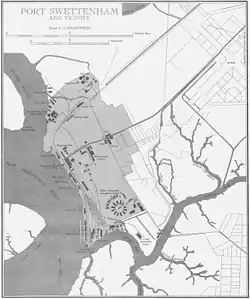 Between World Wars I and II, the port experienced much growth and expansion, peaking in 1940 when tonnage rose to 550,000 tonnes. During the Second World War Allied aircraft were serviced by RAF Servicing Commandos at airfields in Port Swettenham.[19] Its location is marked on a 1954 map by the United States Army. Much of the port's facilities that were damaged during the war were reconstructed. The port expanded to the south with permanent installations to handle more palm oil and latex, two increasingly important exports. Imports also grew tremendously, and tonnage of cargo handled at the port far exceeded what was thought possible before the war.[20]
