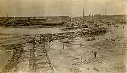 In the winter of 1912-13 the site was surveyed and construction of a wharf began in the spring, followed by buildings and other infrastructure built during the summer. The brand new Canadian research ship CSS Acadia was sent from Halifax to chart the harbour and approaches in the summer of 1913 and 1914. However the whole harbour project was fraught with problems from the start. Material shortages, labour disputes, storms, fires, and boating accidents led to major delays. Another setback was the necessity to completely redesign the harbour because the fast flowing Nelson River was building up silt on both sides of the wharf. Therefore, the harbour was changed to a small man-made island farther out in the river. The island was connected to the mainland with a seventeen-span truss bridge, built by Dominion Bridge Company of Montreal.[1] The Port Nelson, a wrecked dredge, currently lies on the island.[12]