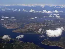 Port Orchard, part of Washington state's Puget Sound, is the strait that separates Bainbridge Island on the east from the Kitsap Peninsula on the west. It extends from Liberty Bay and Agate Pass in the north to Sinclair Inlet and Rich Passage in the south. It was named in May 1792 by George Vancouver after Harry Masterman Orchard, ship's clerk of Vancouver's ship Discovery.[1]