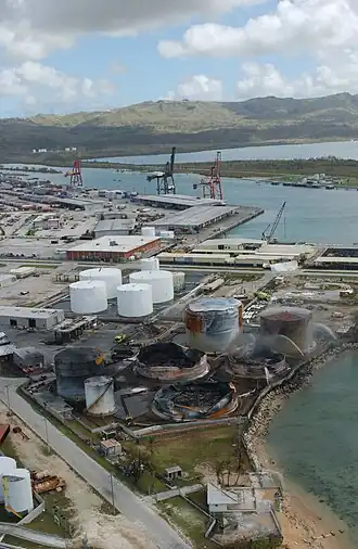 The Port of Guam (officially, Jose D. Leon Guerrero Commercial Port) handles over ninety percent of total imports to the United States island territory of Guam.[2] Located in the north of Apra Harbor on Cabras Island, it shares harbor waters with Naval Base Guam and two small marinas.[3] Family Beach on the Glass Breakwater is owned by the Port Authority of Guam, as well as numerous other water recreational businesses leased by the Authority.