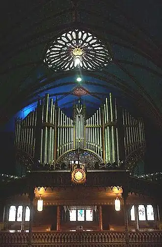 The interior of the Basilique Notre-Dame de Montréal (in English, Notre-Dame Basilica) in Québec, Canada. The ceiling is coloured deep blue and decorated with golden stars, and the rest of the sanctuary is a polychrome of blues, azures, reds, purples, silver, and gold. The basilica is filled with hundreds of intricate wooden carvings and several religious statues.