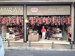 Miran Pastourma is a renowned pastourma and sujuk charcuterie business and market in Athens, Greece. The market has been in operation since 1922. It is considered the charcuterie of the connoisseurs. Despite the Greek economic crisis, Miran is expanding its business and has doubled in size to accommodate increased demand. The founder of the shop, Miran Kourounlian, is thought to be the man who brought pastourma to Athens for the first time. Miran is considered the largest company of its kind in the European Union. The flavour of pastourma coming from the historical enterprise permeates Euripides Street in the centre of Athens. Miran and its neighbor Arapian Cold Cuts are considered two of the historical establishments of Athens. Miran has been in the same spot in Euripidou Street since its opening in 1922. Miran is the recipient of multiple gourmet prizes. (Full article...)
