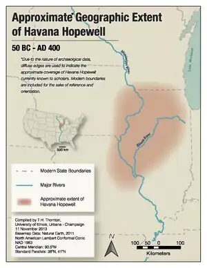 This map shows the approximate extent of the Havana Hopewell culture. The Havana interaction sphere was located in the Illinois and Mississippi river valleys in Iowa, Illinois, and Missouri from 200 BCE to 400 CE.