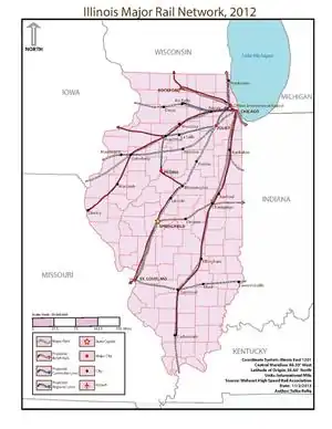 Map of the major railroads in Illinois. Illinois has an extensive passenger and freight rail transportation network, and Chicago is the largest and most active rail hub in the United States.