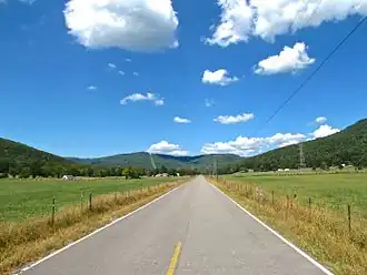 Eastbound on Pennsylvania Route 248 near Palmerton, Pennsylvania. The large mountains in the background are part of the Blue Mountain ridge; Lehigh Gap is to their right.