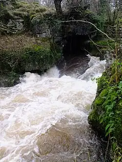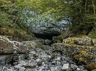 Porth yr Ogof is a solutional cave near the village of Ystradfellte, near the southern boundary of the Brecon Beacons National Park in Wales. It lies on the course of the Afon Mellte, a river whose name translates as 'lightning', commonly explained as a reference to the "flashy" nature of the river, i.e. its rising and falling rapidly in response to rainfall. In 1998 the cave's passageways had been measured as over 2.25 kilometres (1.40 mi) in length. Among the cave's fifteen entrances is the largest cave entrance in Wales and one of the largest in the UK, nearly 20 metres (66 ft) wide and 8 metres (26 ft) high.[1] The cave was used as a show cave many years ago, but is not as attractive as more decorated caves such as Dan yr Ogof, and so today is more often used to introduce people to cave exploration.